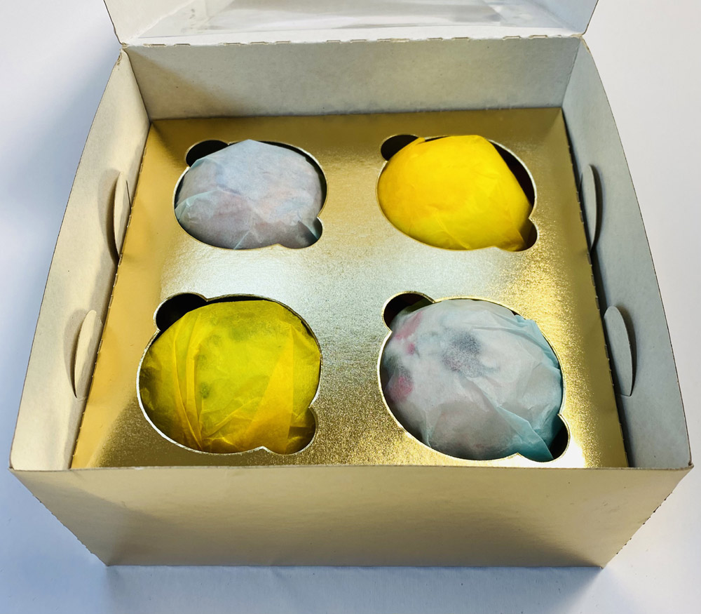 Setul de bile de baie are ca si ambalaj cutie aurie cu capac transparent.